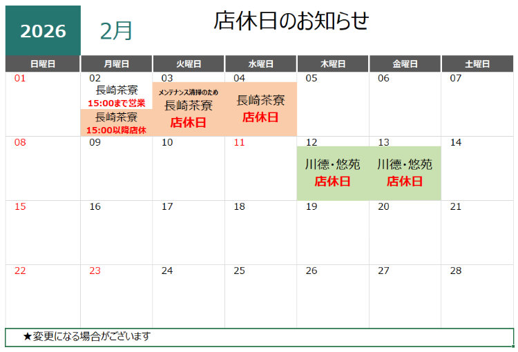 2月の店休日のお知らせ